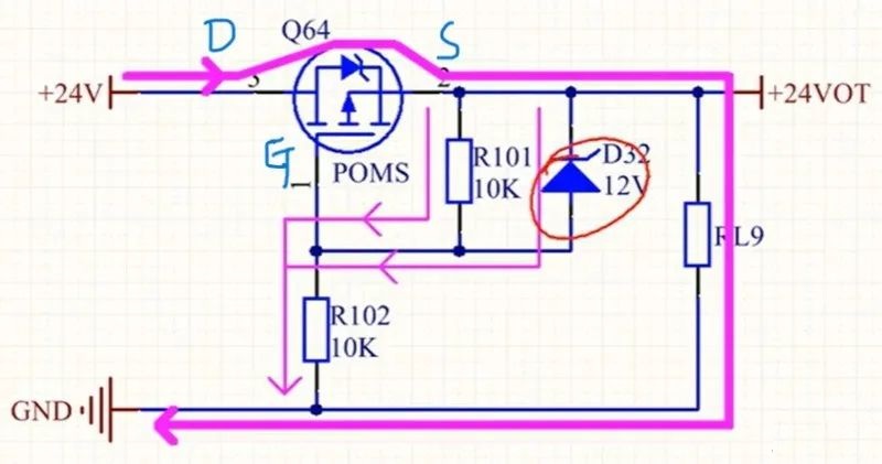 First, it's essential to know that NMOS and PMOS are different. Reverse polarity protection in power supplies typically uses PMOS. How do you distinguish them? Look at the gate arrow: pointing toward the gate indicates an NMOS, while extending from the gate indicates a PMOS. The following is a reverse polarity protection circuit using a PMOS.